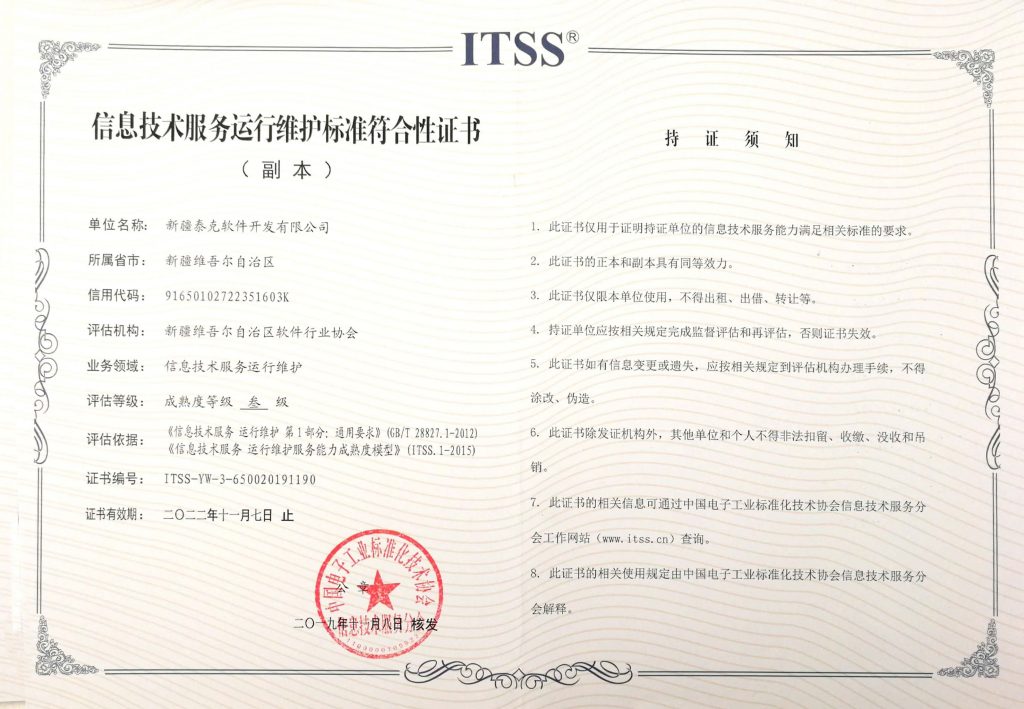 ITSS信息技術(shù)服務(wù)證書 新疆泰克軟件開發(fā)有限公司
