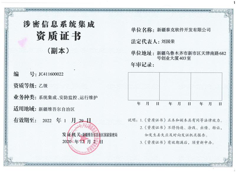 涉密信息系統(tǒng)集成資質(zhì)證書 新疆泰克軟件開發(fā)有限公司